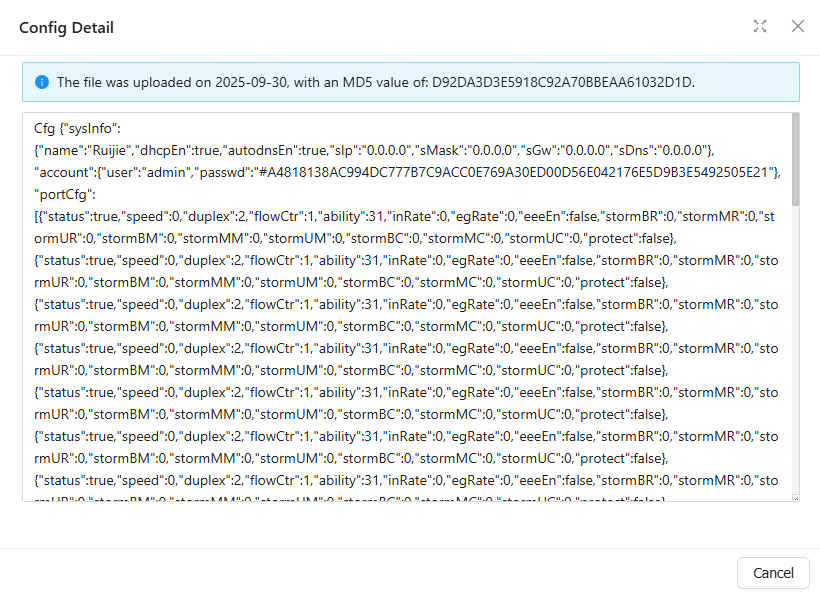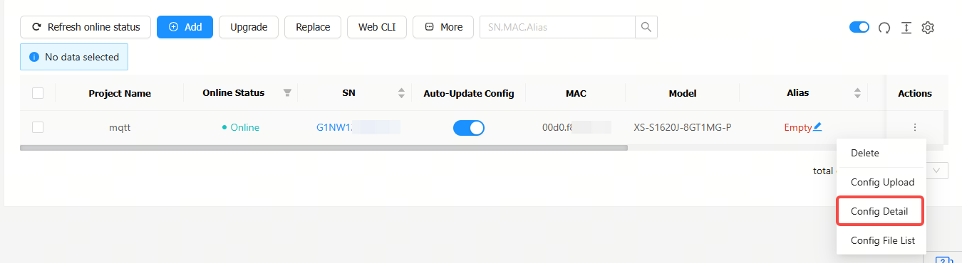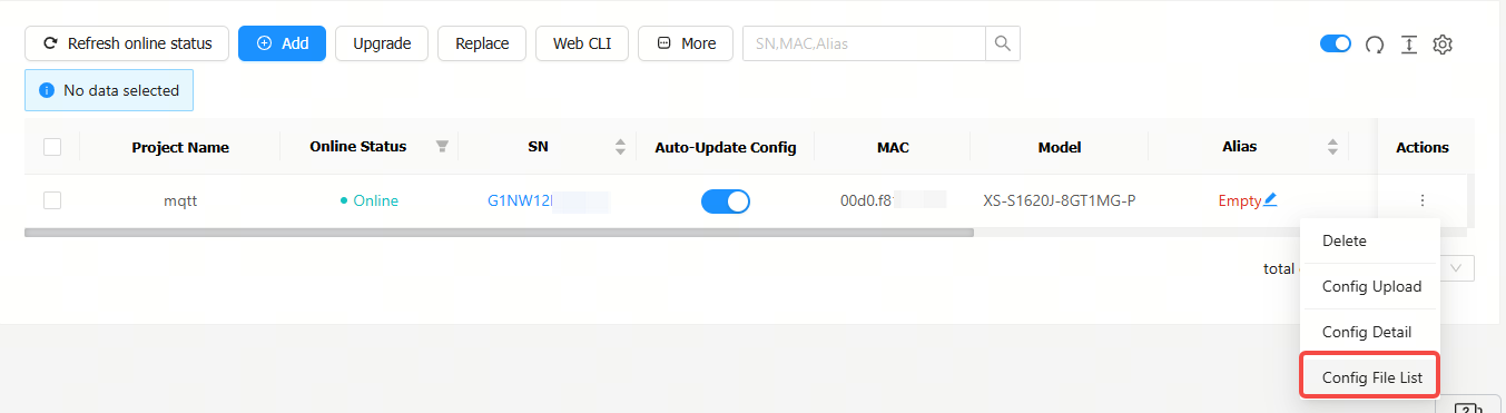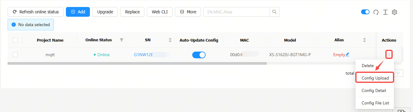 Step 1: Click the   icon in the Action column of a XS-S1620J switch, and then click Config Upload.
