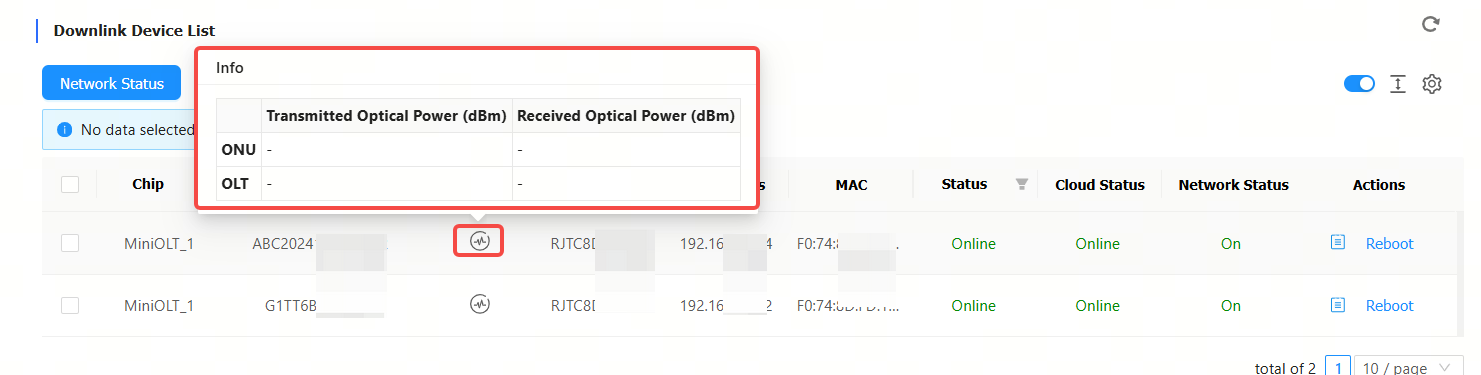 3. Support the display of transmit optical power and receive optical power for the PON interfaces of RG-MT3002 and RG-MU3064.
