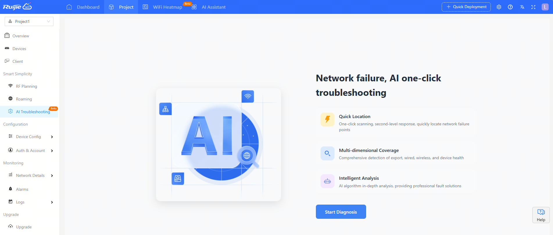Add AI Troubleshooting feature for device diagnosis. The feature is applicable only to XS-S1930J series switches and RG-AP180 series access point (not including the hardware version of V4).